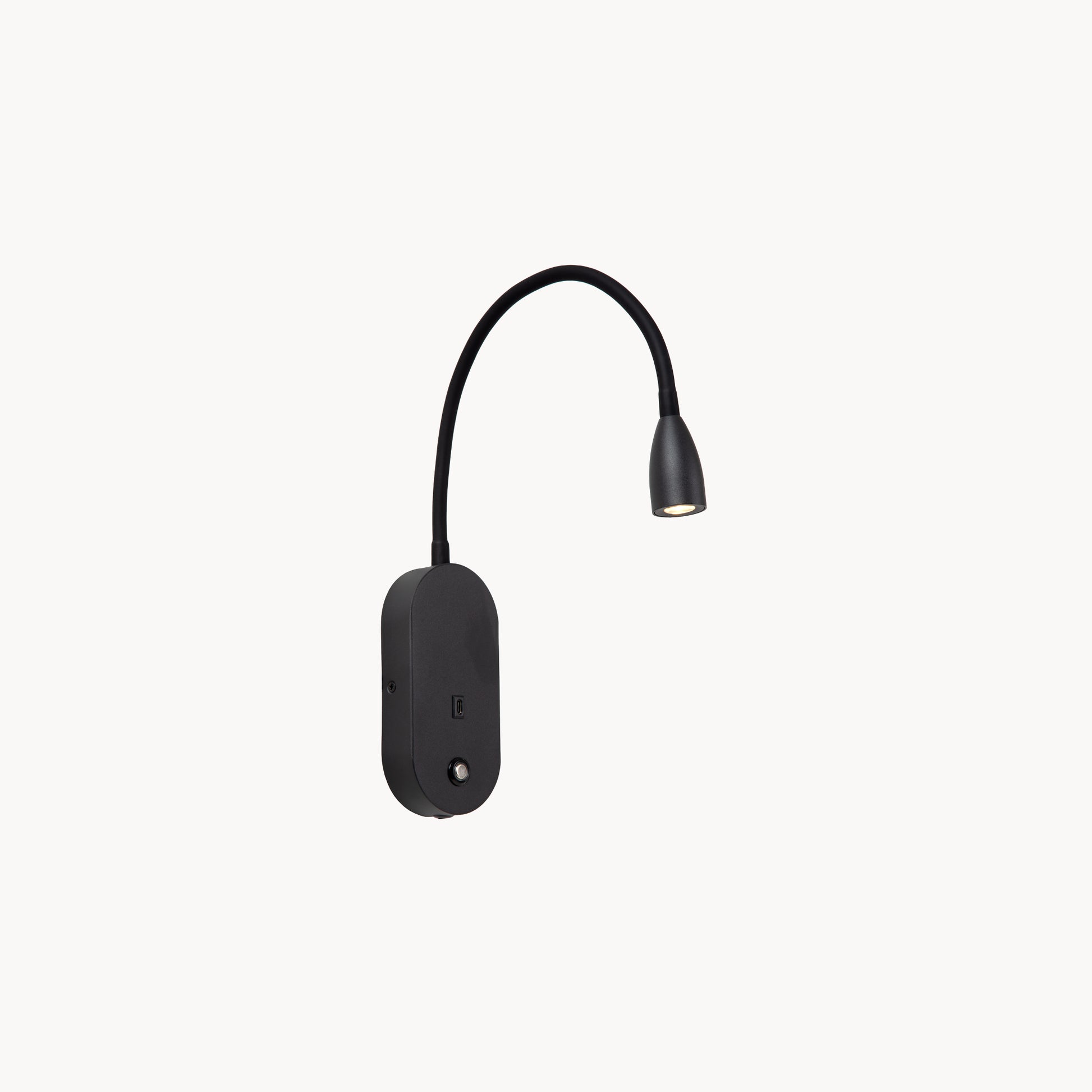 Bedside lamp with flexible arm and the option to easily charge your devices.