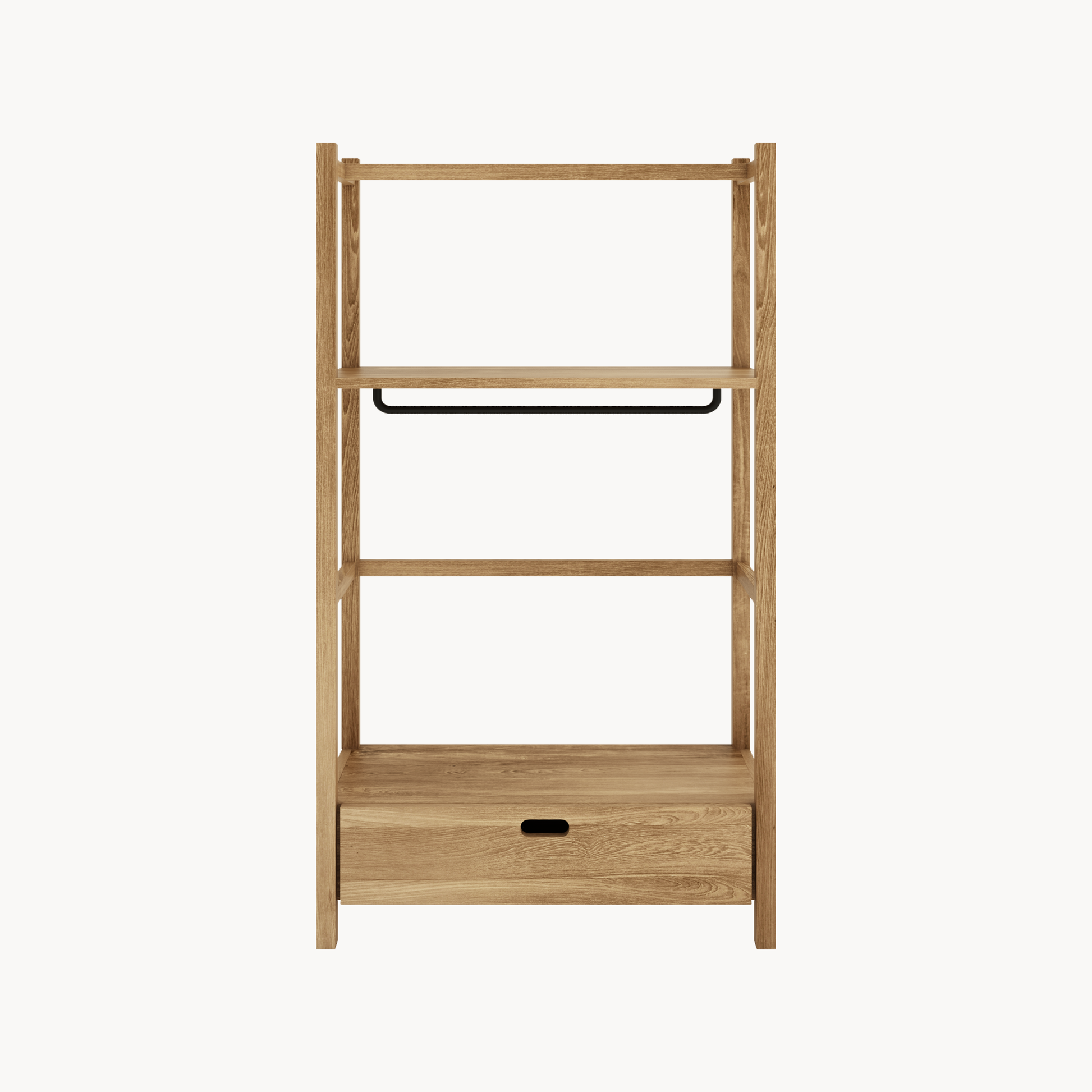 Kledingrek Thor vervaardigd uit hout met legplank, een kledingroede en een lade voor extra opbergruimte.