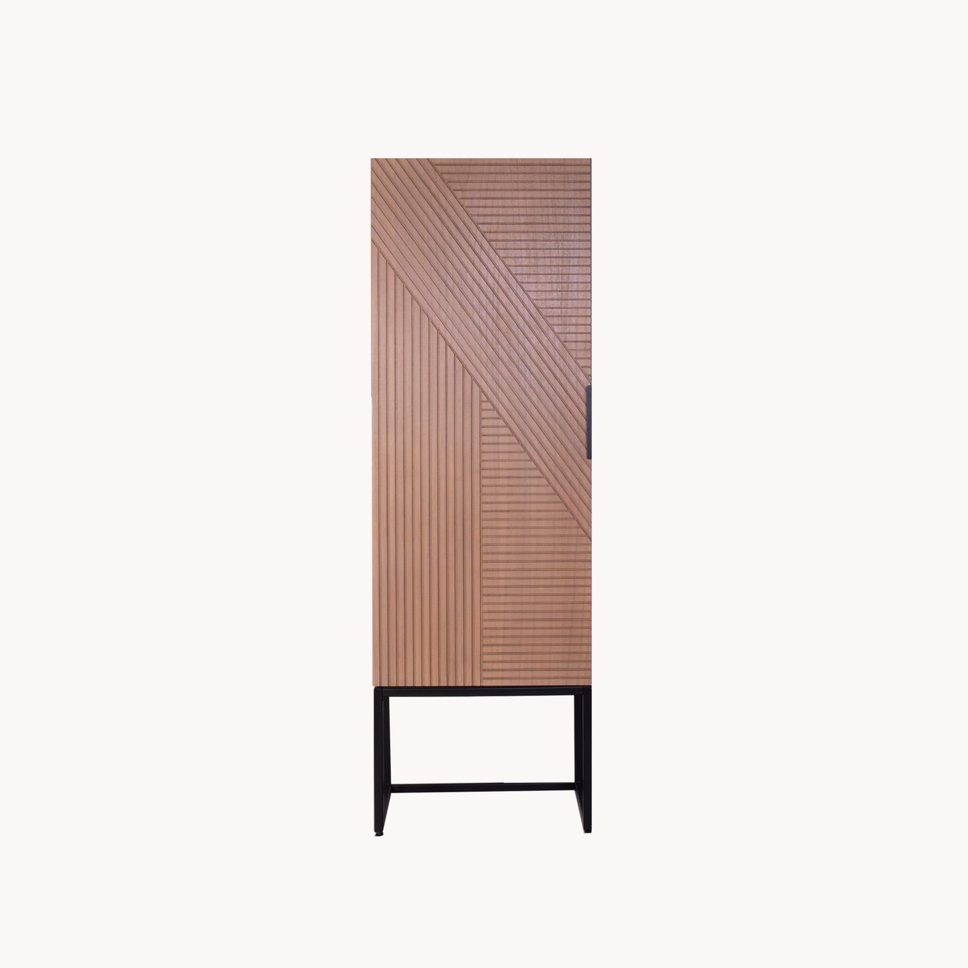 De kast Mozaic is een stijlvolle multifunctionele kast van natuurlijk hout in combinatie met een stalen frame. De deuren van de kast zijn voorzien van een mozaïekpatroon.