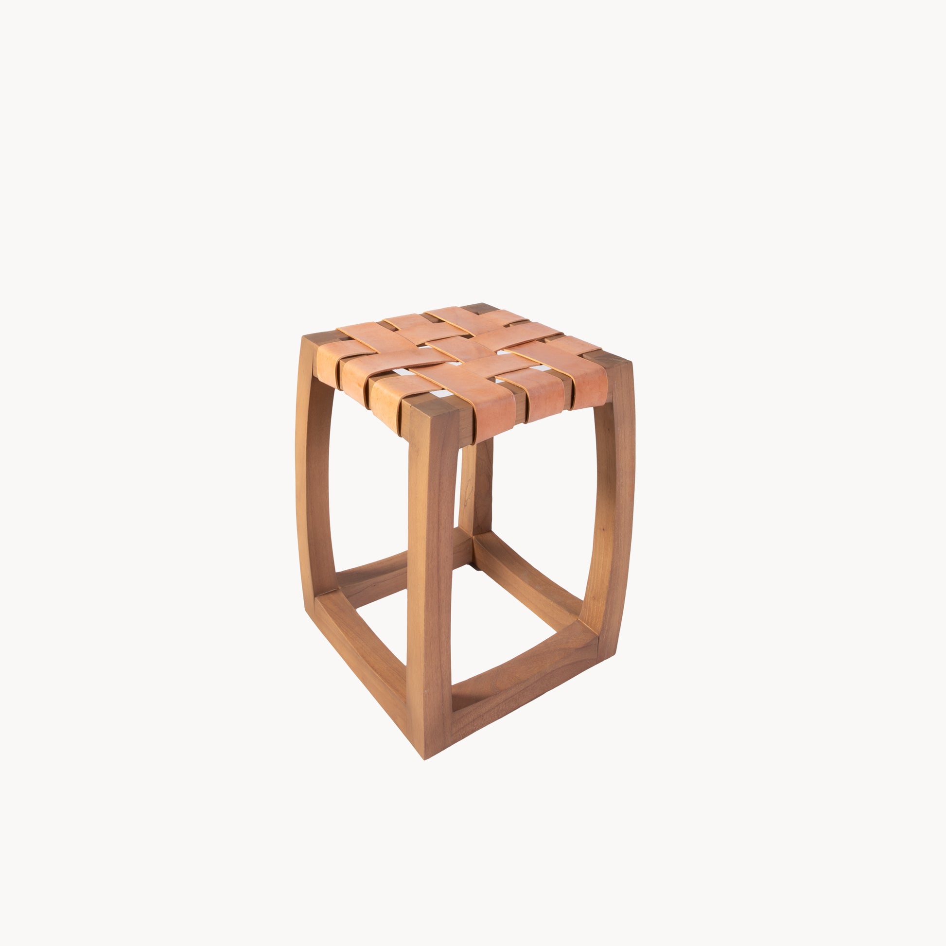 Verfijnd afgewerkte kruk van hout en leren banden.