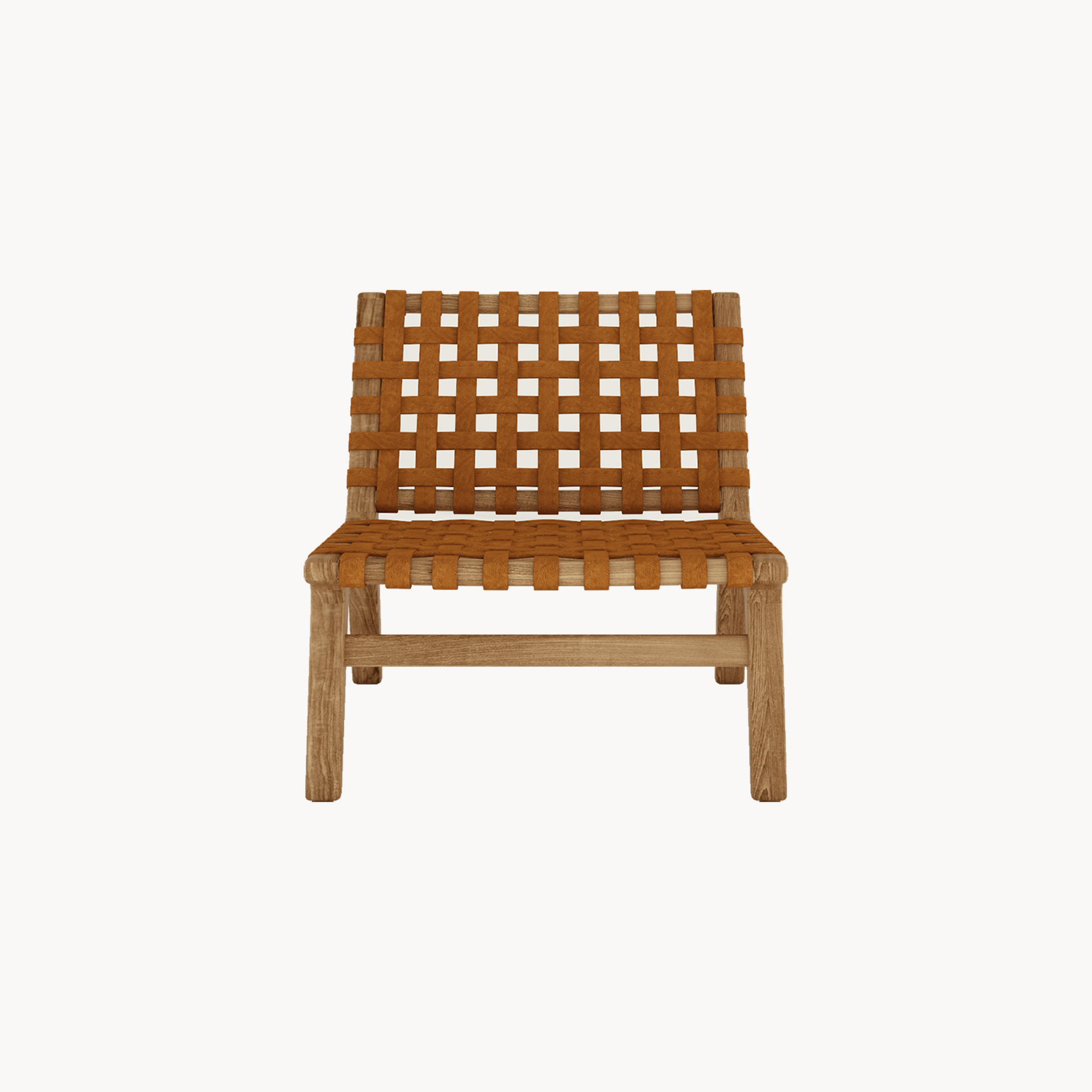 Rustieke lounge stoel van hout waarvan de zitting is bekleed met brede, geweven leren banden.