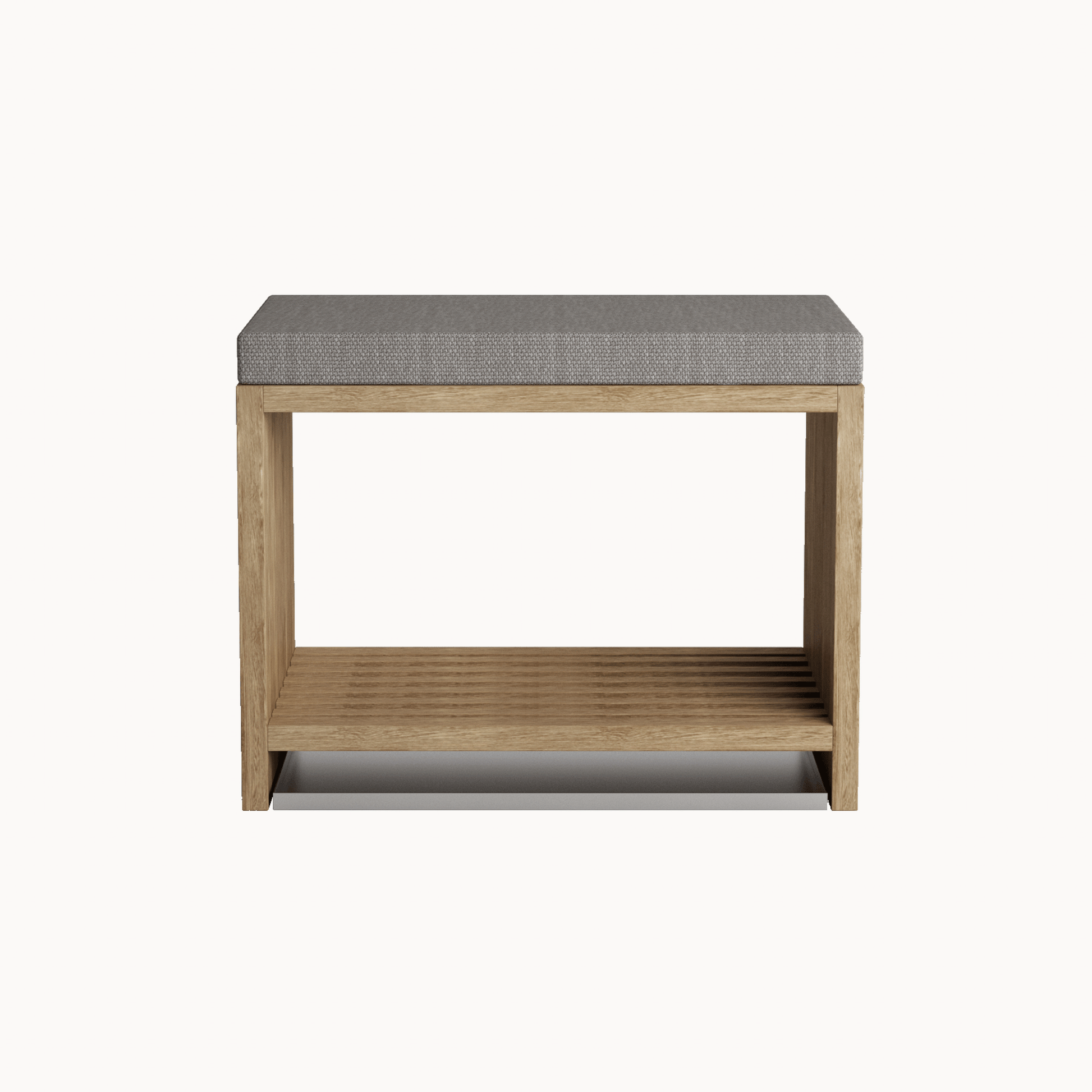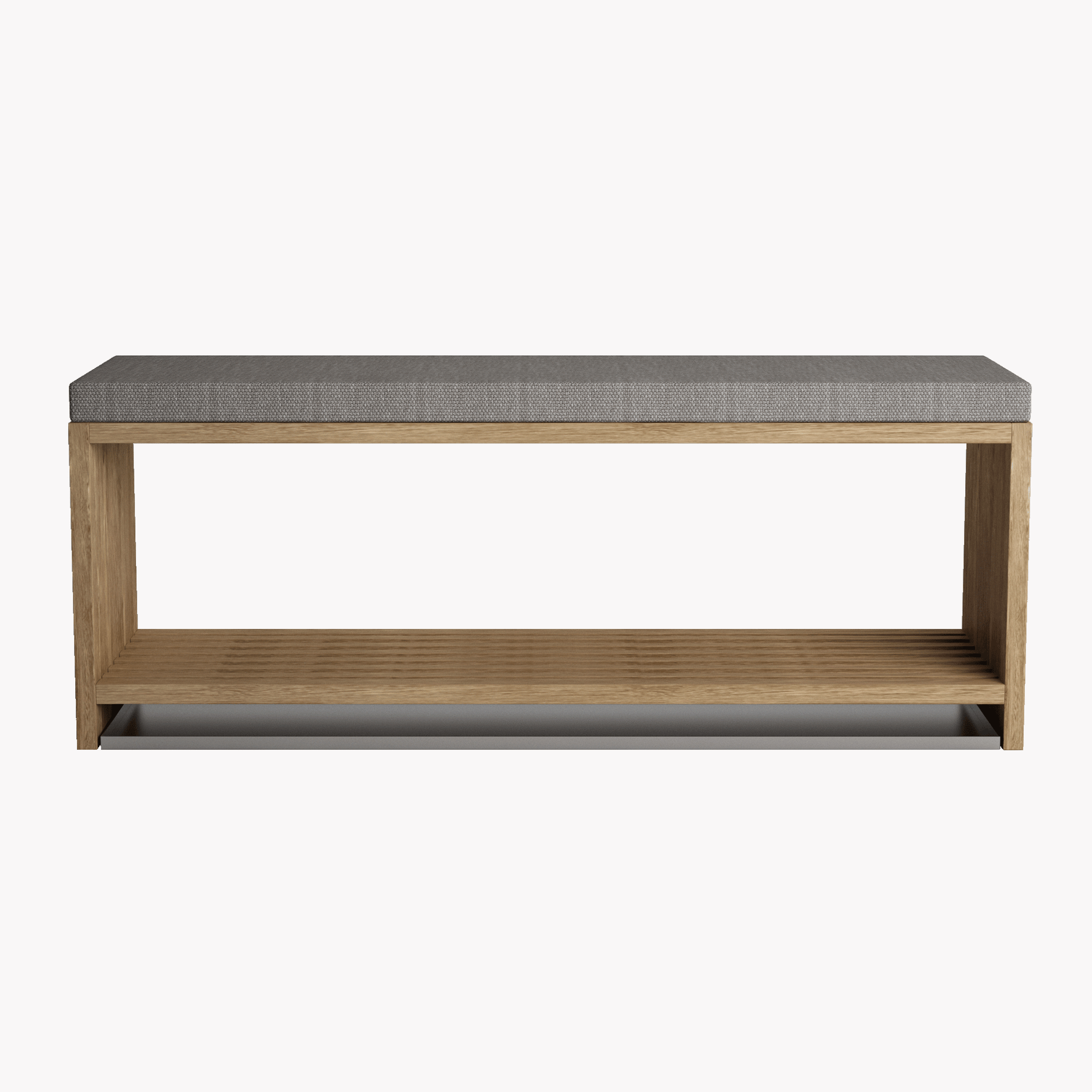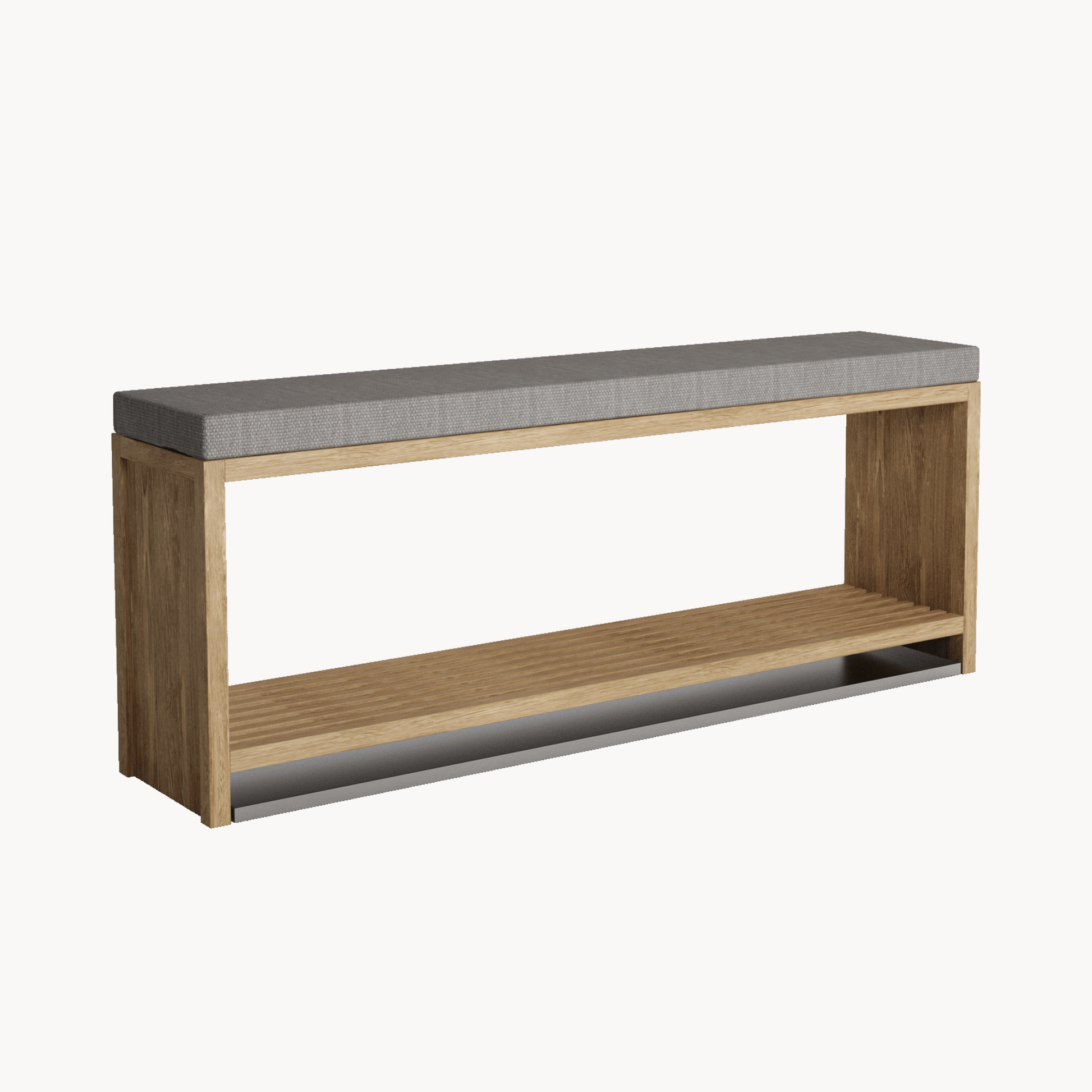 Schoenenrek met opbergmogelijkheden en zitkussen.