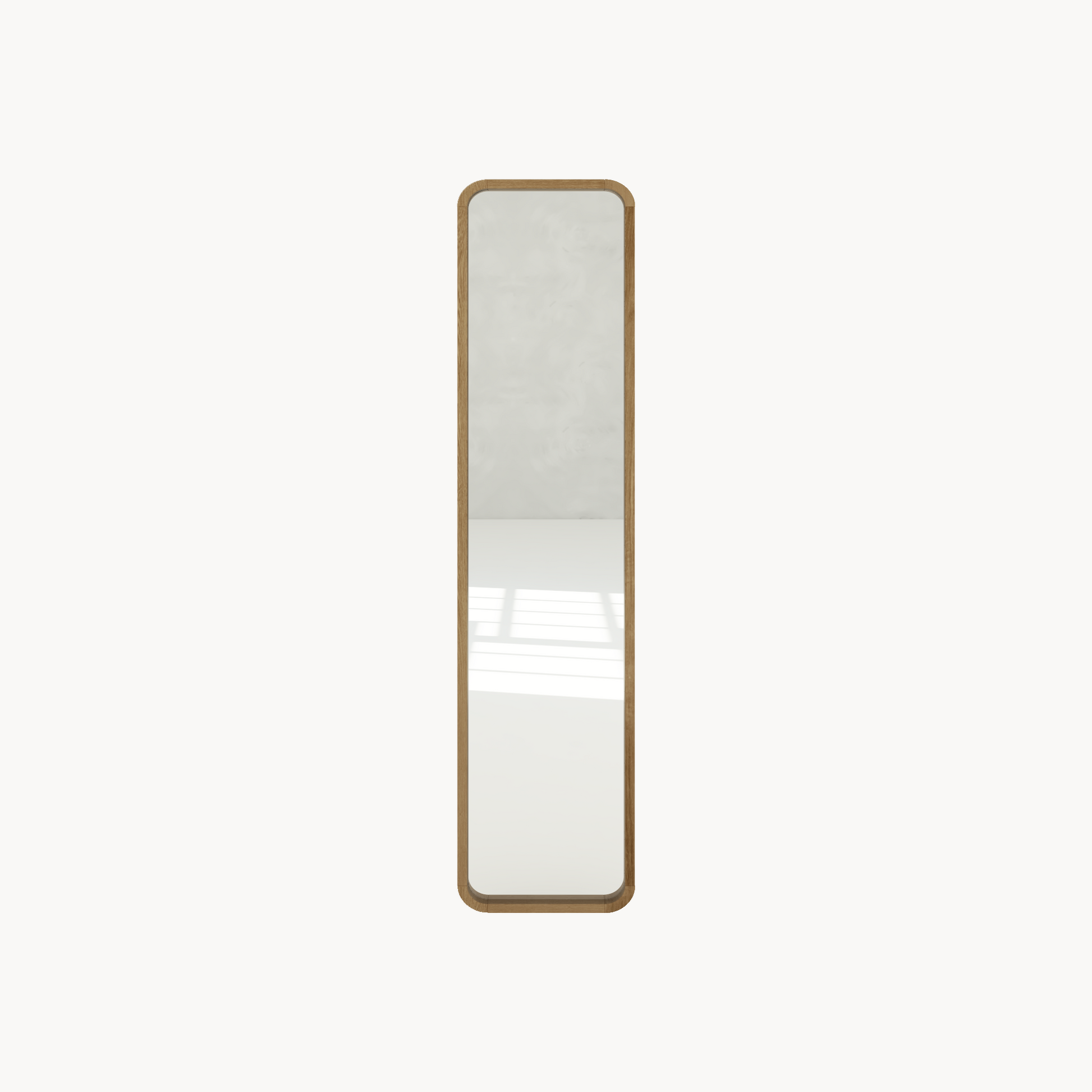 Spiegel rechthoek met houten frame en afgeronde hoeken.