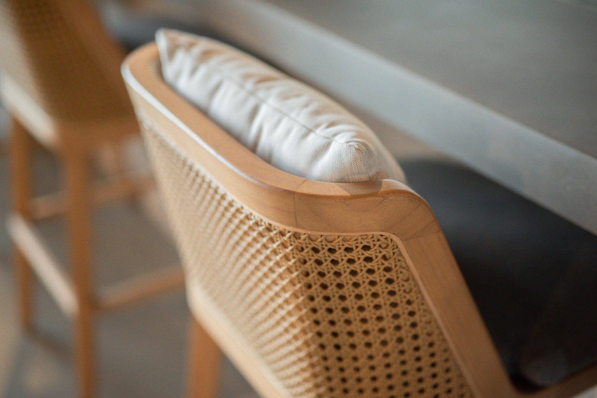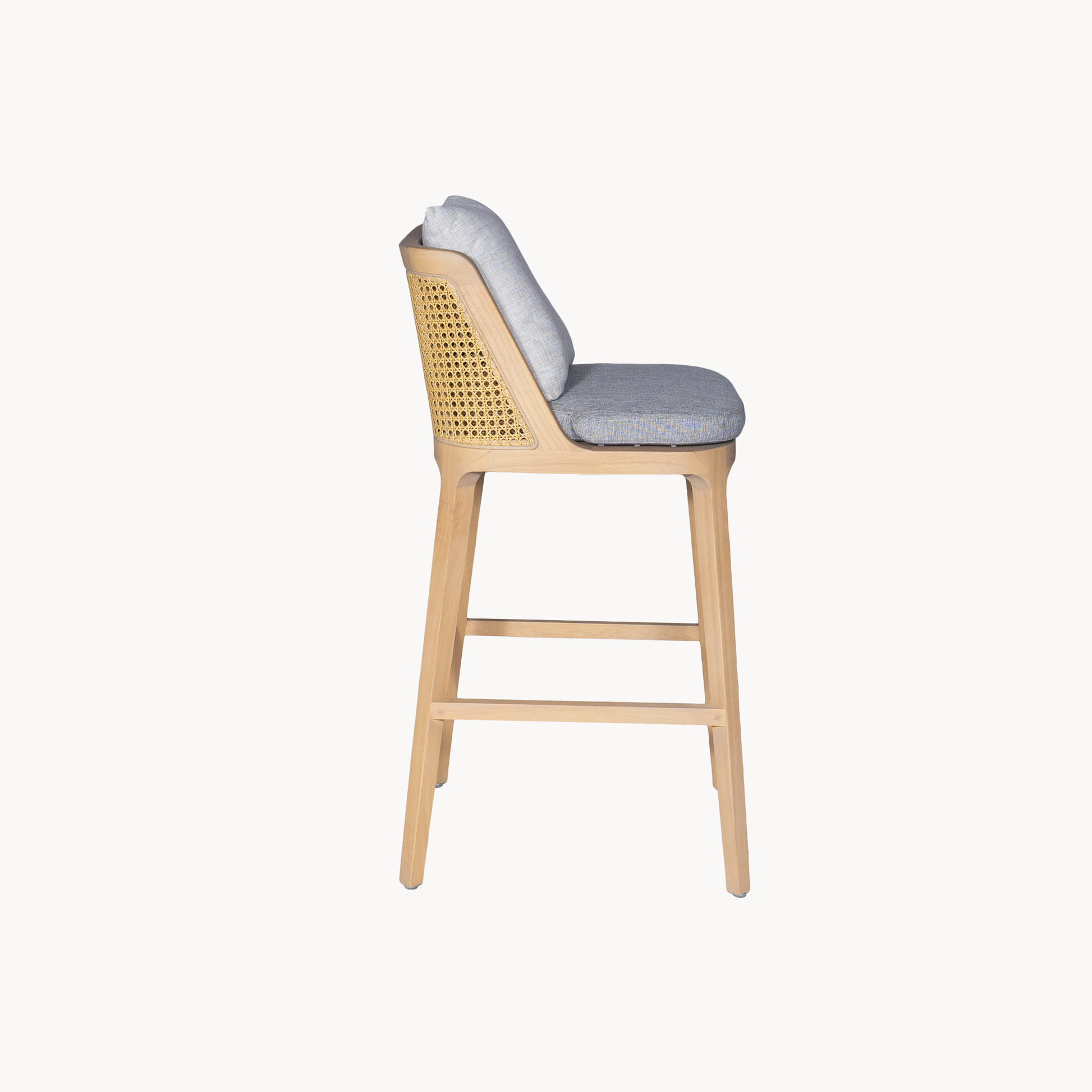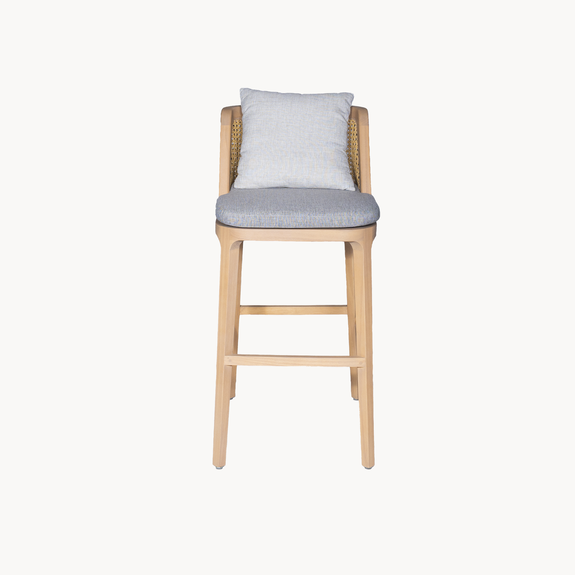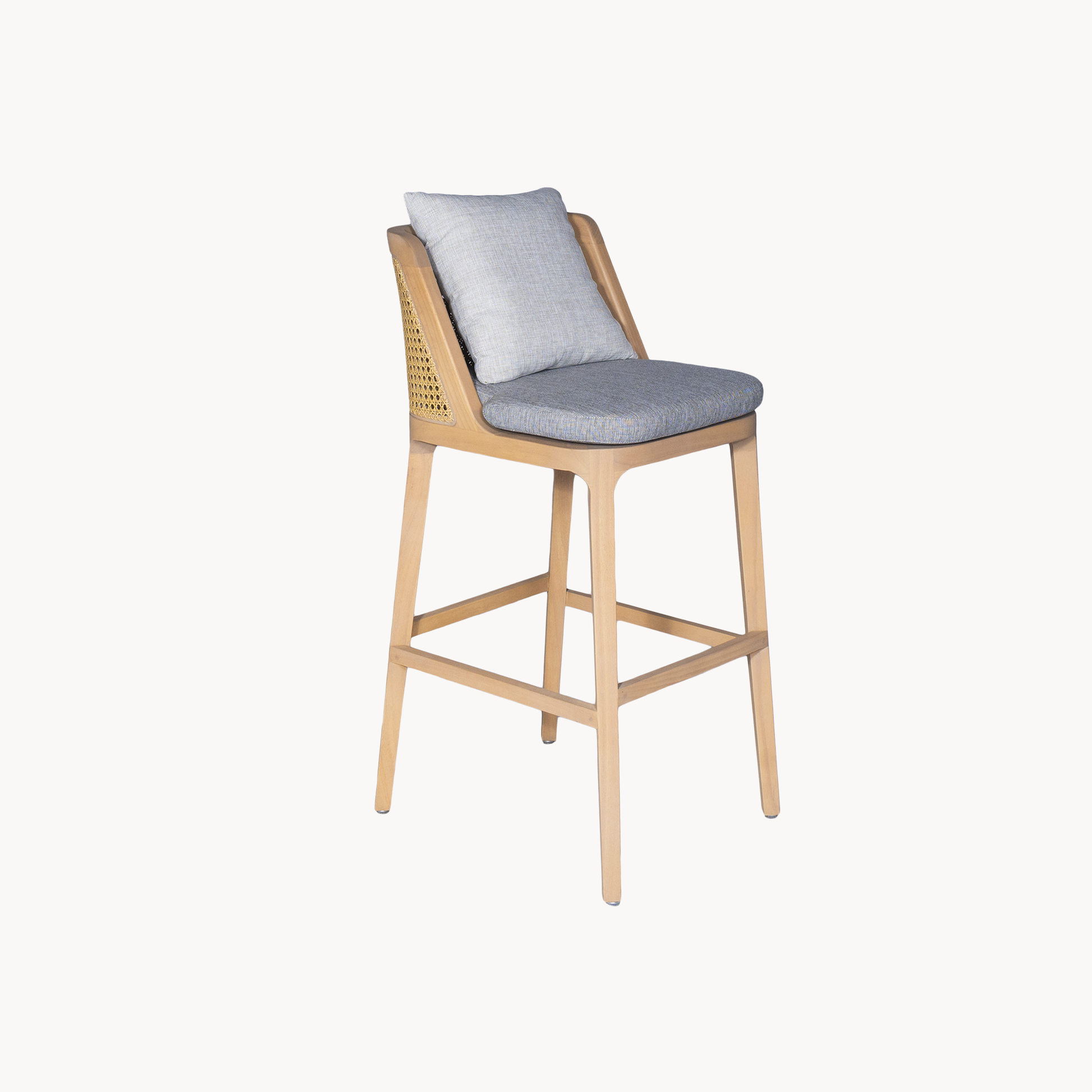 Elegante barkruk met een massief houten frame met een hoge, comfortabele rugleuning voorzien van synthetic rotan webbing en een afneembaar kussen. Zithoogte 65 cm en 75 cm.