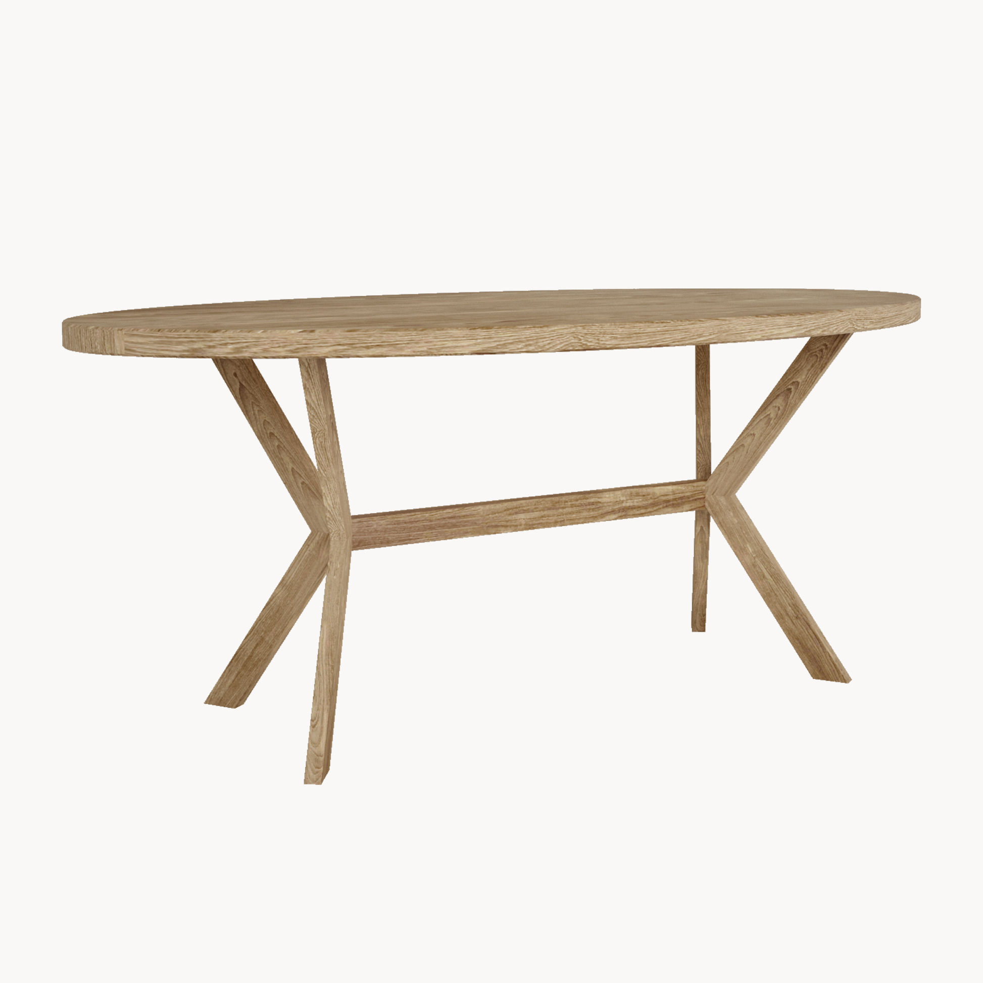 Rustieke ovale eettafel met een verlengde X-poot onderstel.
