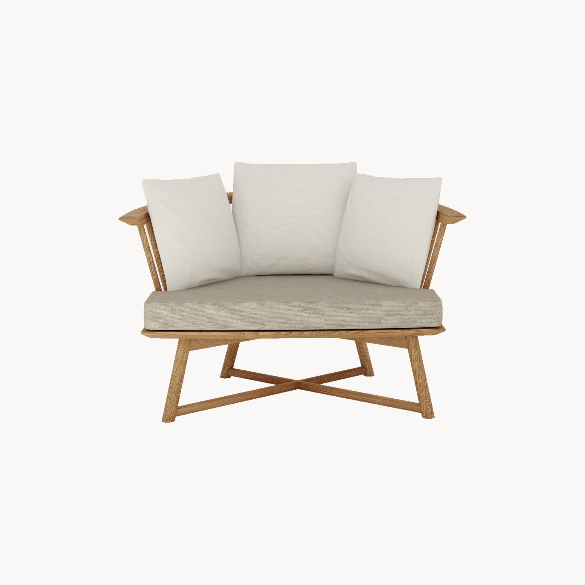 Deze riant ruime lounge fauteuil Moon XL heeft een luchtig design dat een vleugje tropische sfeer aan elke ruimte toevoegt. Gemaakt van stevig hout, biedt de fauteuil een warme uitstraling. De rugleuning met spijlen zorgt voor een speelse en open look, terwijl de comfortabele zit- en rugkussens voor optimaal zitcomfort zorgen. De poten zijn elegant vormgegeven in een kruisdesign, wat stabiliteit en een unieke stijl biedt.
