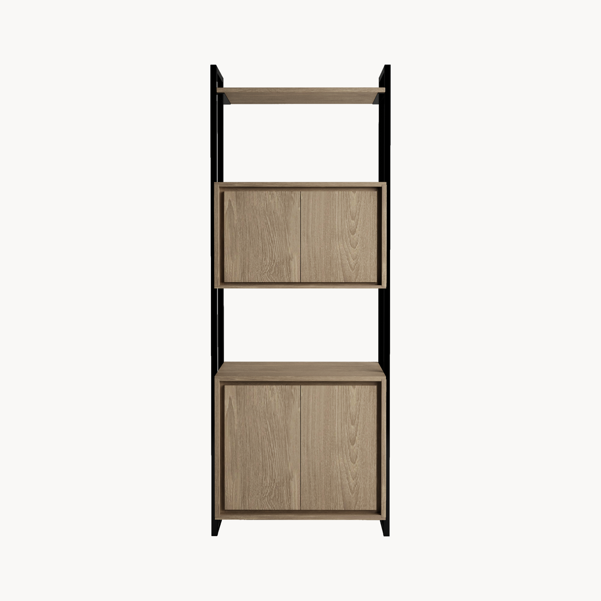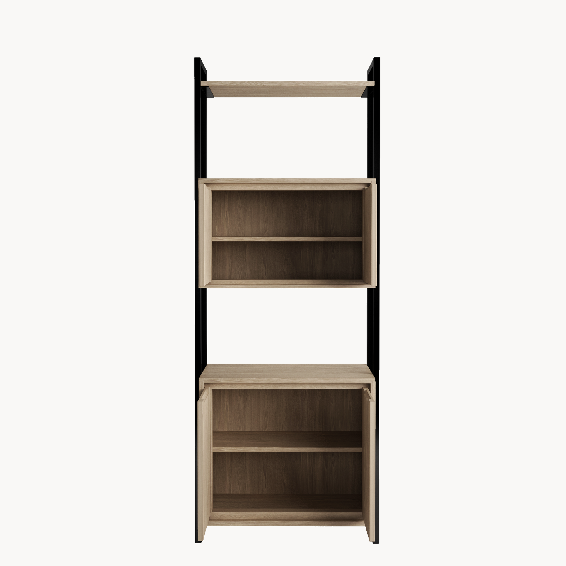 Moderne opbergkast met houten opbergvakken en een open plank.