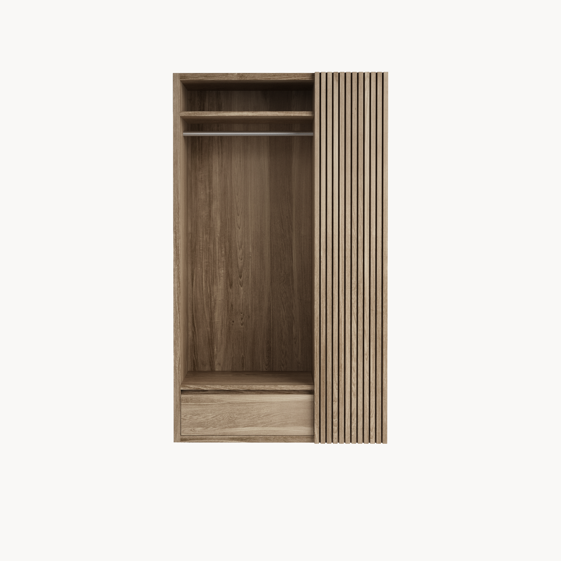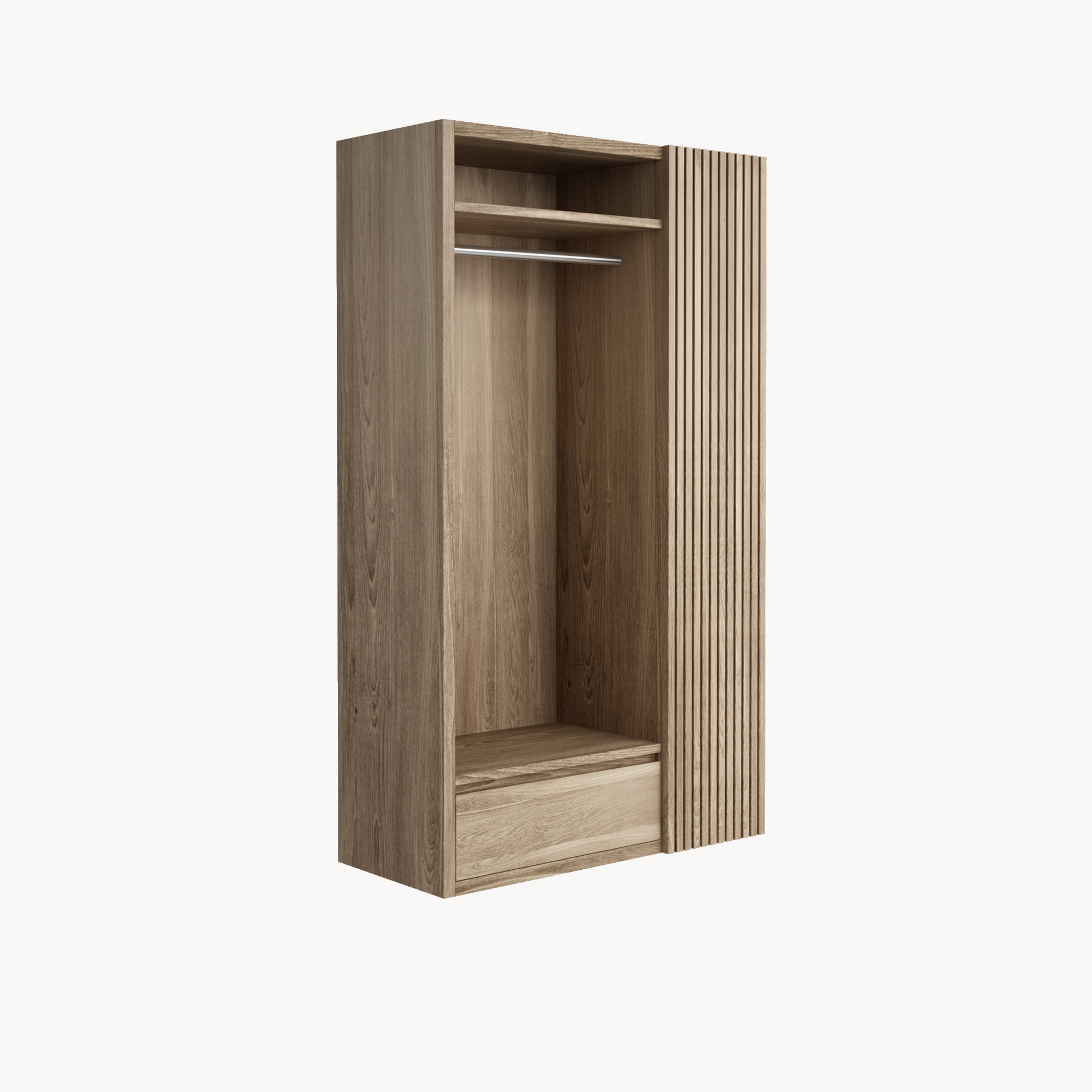 Een zwevende houten kledingkast die aan de muur wordt bevestigd, met een stijlvol en praktisch ontwerp. Het open gedeelte is voorzien van een kledingroede om kleding op te hangen, terwijl het gesloten gedeelte is uitgerust met meerdere planken voor het netjes opvouwen en opbergen van kleding. De kastdeur heeft een strak design en sluit soepel. Daarnaast bevat de kast een handige lade aan de onderkant voor extra opbergruimte, ideaal voor accessoires of kleinere items. Deze kast combineert functionaliteit met een modern, minimalistisch uiterlijk.
