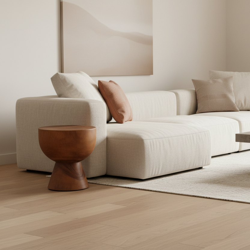 Sculpturale bijzettafel van massief hout in de vorm van een Djembe-trommel. Een kunstzinnig meubelstuk met etnische uitstraling.
