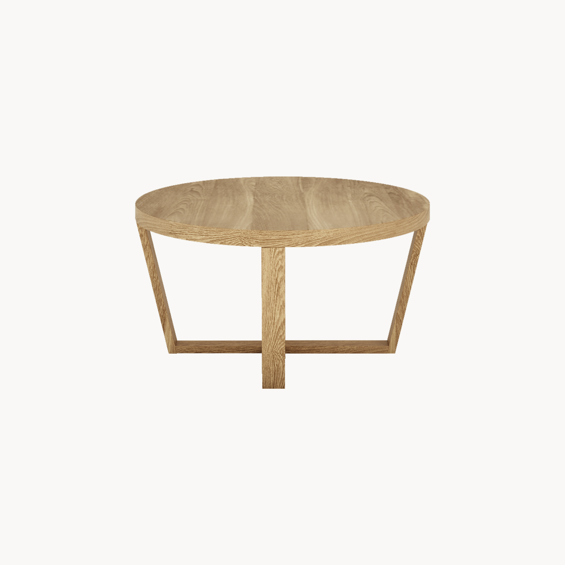 De salontafel Cross Miring is volledig van hout en heeft een taps toelopend kruisvormig frame dat op de vloer ligt. Dit ontwerp zorgt voor een stabiele basis en een eigentijdse uitstraling.