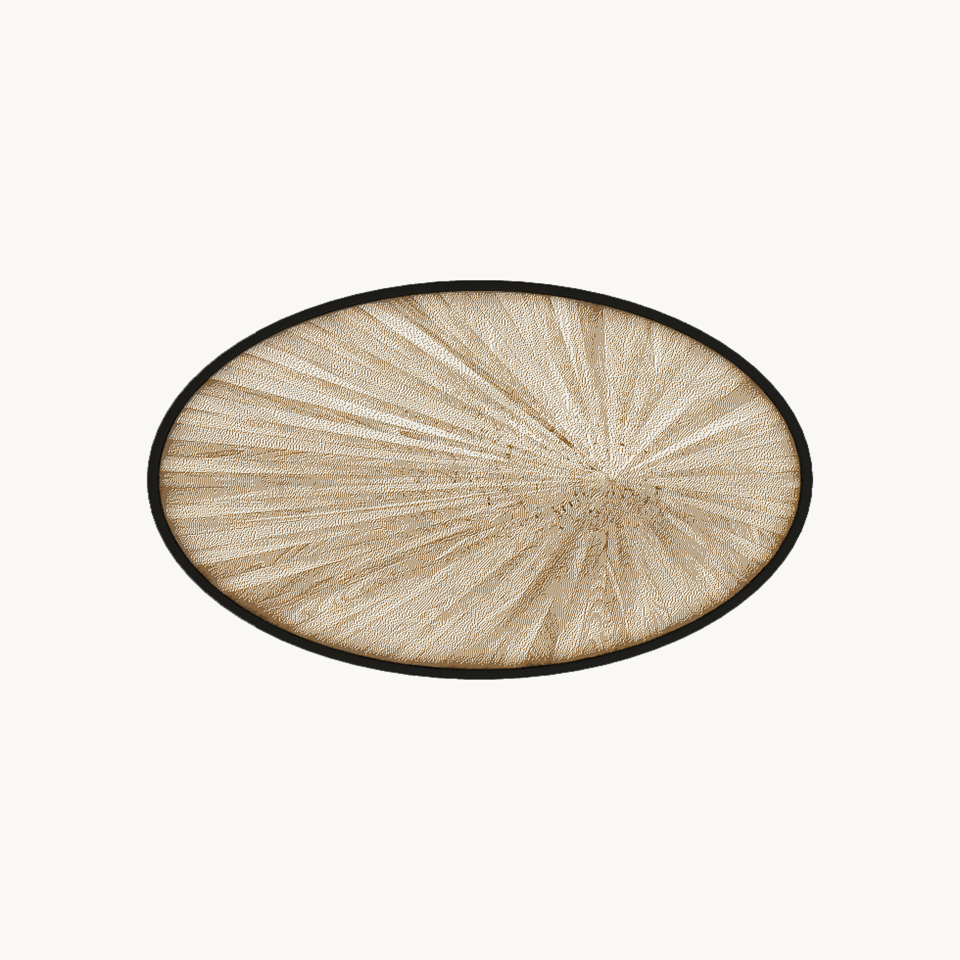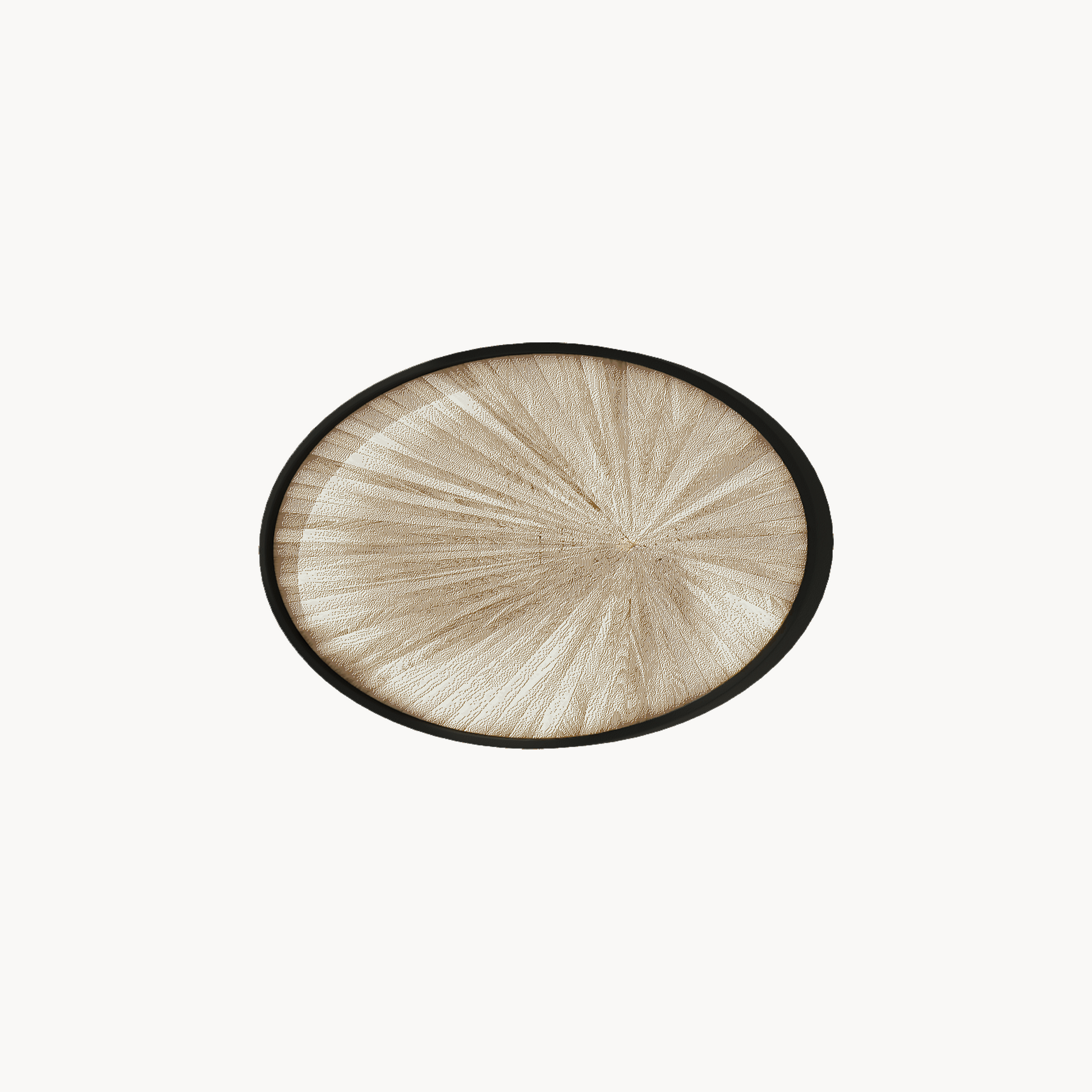 Abstract wand decoratie vervaardigd uit hout met zwarte lijst.